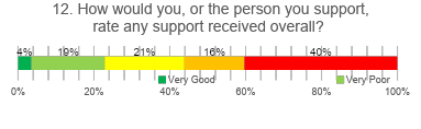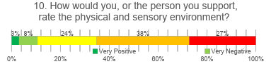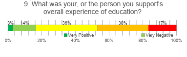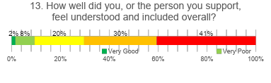 Figure 9. Overall Experience of Education is overwhelmingly negative (53% said it was either negative or very negative), with only 10% saying that their experience was positive to very positive. It would be easy to conclude, when looking at figure 10. Rating the physical and sensory environment, that the reason for this is purely environmental. However, figure 11and 12also show very similar levels of both positive and negative outcomes regarding obtaining reasonable adjustments (9% easy to very easy compared to 60% responded that it was hard or very hard) and overall support (56% rated it as poor or very poor, compared to 13% rating overall support as good to very good) respectively. What this shows is that there is a systemic failure, not one sole source. Given those results, it is no surprise that respondents felt inclusion and understanding where predominantly low, with only 1% saying it was very good, and 8% saying it was good (figure 13). 71% rated inclusion as poor or very poor.