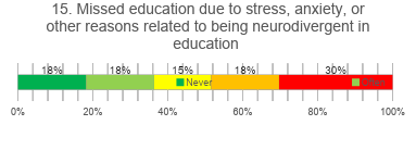 It is no surprise therefore that figure 15. How often did you miss education due to anxiety, stress or other reason related to being Neurodivergent and in education, shows 49% of respondents said ‘sometimes’ to ‘often’. Only 18% said they had never missed education for these reasons. Whilst not part of this study, the long-term effects of these absences on successful life outcomes are worth a study. If we took those percentages and applied them to our community, based on population figures, we are potentially looking at close to 100,000-120,000 people being continuously and systematically failed by the education system throughout their lives in some fashion.