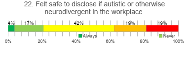Experiences of the workplace are in line with those in Education, in that they are predominantly negative. Figure 18. Overall Experience of applying for and obtaining paid work shows that from the outset our community is facing hurdles to even get paid work, let alone their experiences in work, or work retention rates. A study around work retention rates, and reasons for leaving and/or staying would shed further light on best practices that improve retention rates for neurodivergent individuals. Only 9% felt that their experience of workplace support was positive or very positive, with 53% finding it negative or very negative. This was no doubt affected by respondents’ experience of workplace bullying, with 69% saying that had experienced it in some fashion. There is a clear correlation with discrimination and disclosure, with 65% saying they felt they had experienced it because of being neurodivergent, and only 4% saying that they had always felt safe disclosing their disability.